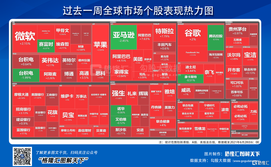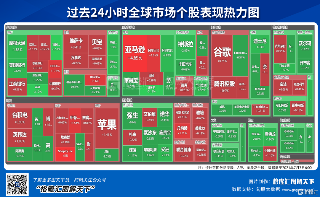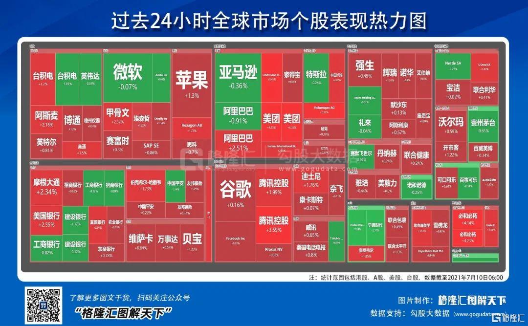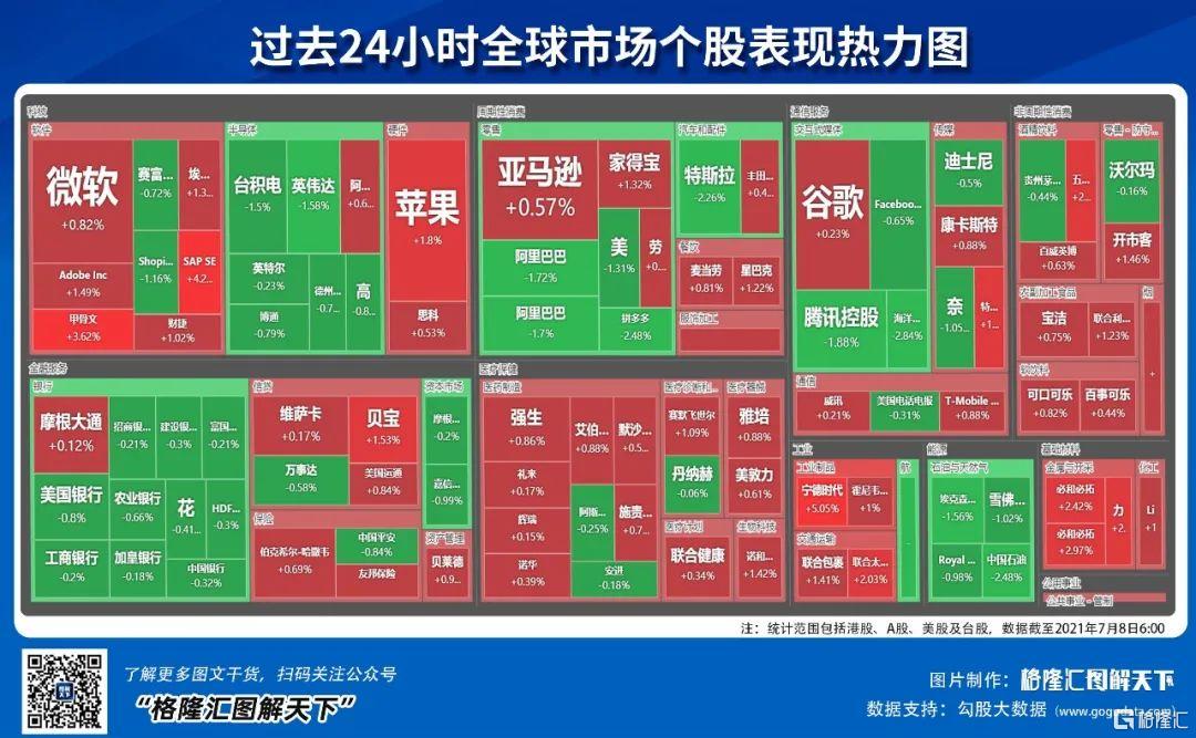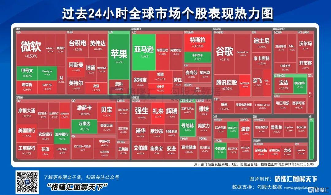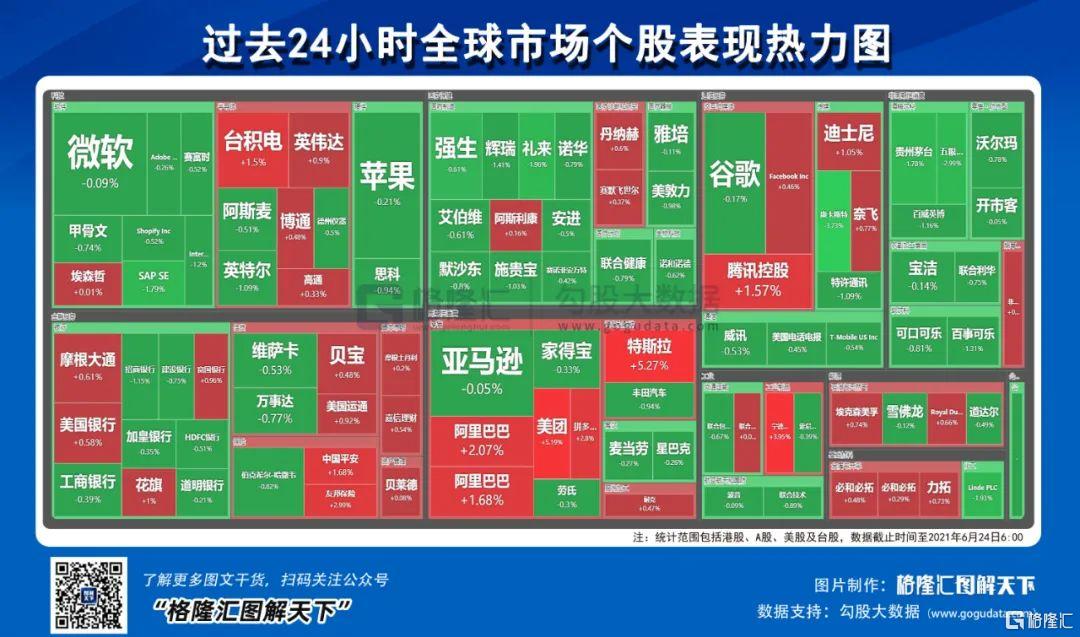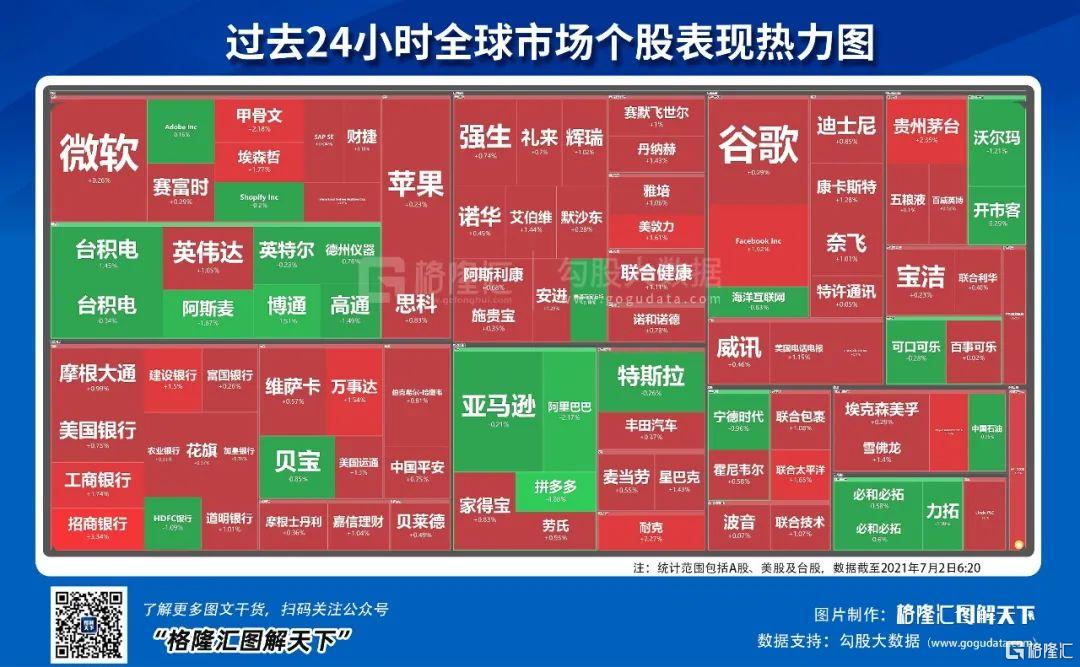 各位早~ 今天是7月1日星期四,祝贺中国共产党百年华诞及香港回归祖国24周年。百年峥嵘岁月,百载辉煌成就,祝愿祖国繁荣富强。接下来早报君先带大家看看过去24小时全球市场个股热点。科技板块中,苹果涨0.46%,微软涨0.18%;金融服务板块中,维萨卡跌0.9%,摩根大通、建设银行涨0.91%;消费板块中,亚马逊跌0.23%,拼多多跌4.89%,美团跌1.05%,贵州茅台跌0.26%,...
