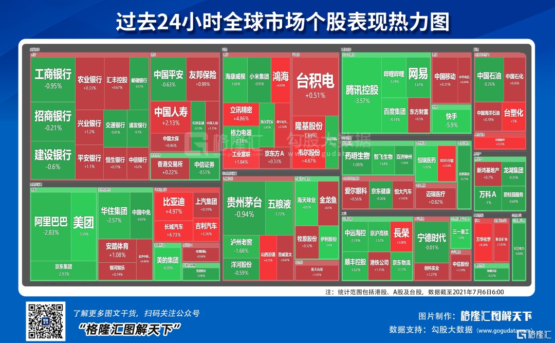 各位早~ 早报君先带大家看看过去24小时全球市场个股热点。美股因“独立日”周一休市一日。金融板块中,金融股涨跌不一,工商银行跌近1%,建设银行跌0.6%,兴业银行、平安银行涨逾1%;保险股中,中国人寿涨超2%,中国人保涨逾1%。硬件板块中,格力电器、海尔智家跌超2%,海康威视、小米跌超1%。半导体板块中,韦尔股份涨超4%,中芯国际跌超2%,隆基股份涨1.69%。由于网络安全审查,科...