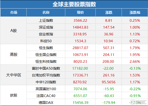 再回顾一下全球其他市场的行情,A股方面,主要指数继续回升,深成指、创业板指实现5连涨。其中,沪指涨0.25%报3566点,深成指涨1%报14843点,创业板指涨1.1%报3318点。两市个股涨跌数参半,成交额连续四个交易日破万亿,北上资金净买入近82亿。整体看,题材概念表现依旧活跃,周期板块整体表现较强,白酒概念遭资金抛售领跌,山西汾酒重挫逾8%。港股方面,三大指数全天呈单边上涨行情,市场情绪较佳。截至收盘,恒指涨1.79%报28817点,国指涨1.95%报10673点,恒生科技指数涨2.66%报8020点。盘面上,生物科技板块爆发领涨,铜、铝等有色金属板块大幅反弹,在线教育股继续下挫。昨日大市成交额为1565亿港元,南下资金净流入19.4亿港元。