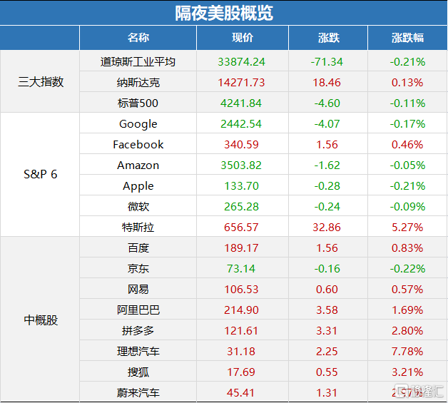 美股方面,受部分美联储官员鹰派讲话影响,标普终结两连阳,道指回吐昨日涨幅,三大指数中仅纳指微涨,续刷历史新高。截至收盘,道指跌0.21%,报33874点;标普500指数跌0.11%,报4241点;纳指涨0.13%,报14271点。新能源汽车股集体大涨,蔚来汽车涨2.97%,小鹏汽车涨4.05%,理想汽车涨7.78%;热门中概股多数上涨,老虎证券涨10%,阿里巴巴涨1.68%,哔哩哔哩涨3.84%,拼多多涨2.80%。