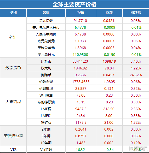 全球主要资产价格方面,COMEX 8月黄金期货结算价收涨0.34%,报1783.4美元/盎司,创最近一周收盘新高。WTI 8月原油期货收涨0.23美元,涨幅0.30%,报73.08美元/桶;布伦特8月原油期货收涨0.29美元,涨幅0.39%,报75.19美元/桶。美元指数刷新四日低位后盘中转涨;比特币一度升破3.4万美元后回落,最新报33411美元/枚,狗狗币涨超20%。