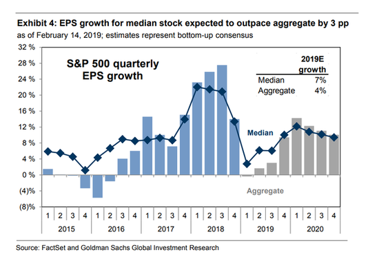 @新浪财经【高盛:美企今年利润可能没有预期的那么糟糕】高盛集团(Goldman Sachs)的数据显示,美国企业今年的利润可能没有很多市场人士预期的那么糟糕。 以大卫·科斯汀(David Kostin)为首的策略师上周五在一份报告中写道,对标准普尔500指数成分股公司收益增长的总体预期掩盖了广泛的差异,这种差异掩盖了一些好业绩的潜力。他们表示,预计2019年每股收益将增长7%,而整体指数仅为4%。