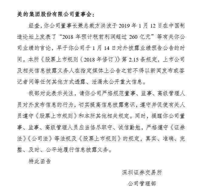 @21世纪经济报道【美的集团董事长提前发表业绩言论,深交所下发关注函】在格力电器独董刘姝威提出质疑的7天后,2月18日晚,美的集团收到来自深交所公司管理部的关注函。内容显示,美的集团董事长兼总裁方洪波于2019年1月12日在中国制造论坛上发表了“2018年预计税前利润超过260亿元”等有关公司业绩的言论,早于美的集团于1月14日对外披露业绩预告公告的时间。