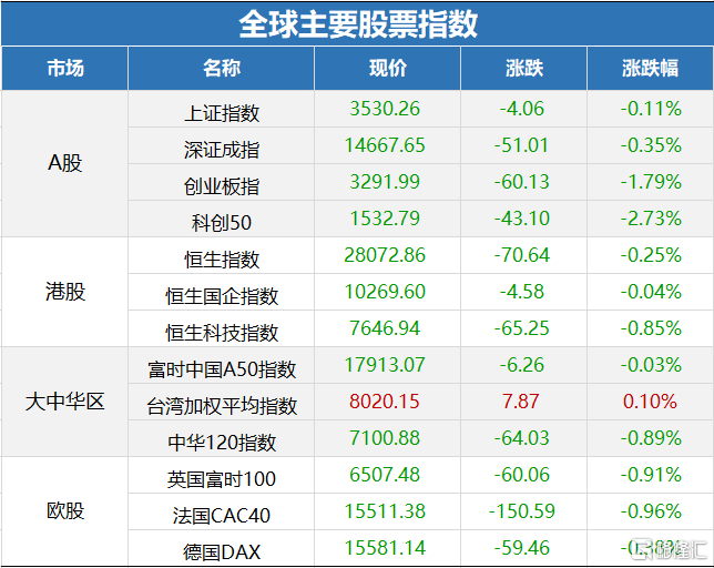 再回顾一下全球其他市场的行情,A股方面,受医药、医疗股影响,两市主要指数早间跳水收跌。尾盘段,指数反弹回升,沪指最终收跌0.11%报3530点,深成指跌0.35%报14667点,创业板指跌1.79%报3292点。全天成交额11200亿元,北上资金净卖出0.6亿元。市场焦点转至碳中和概念,分支电力股普涨,医药、医疗板块遭资金抛售。