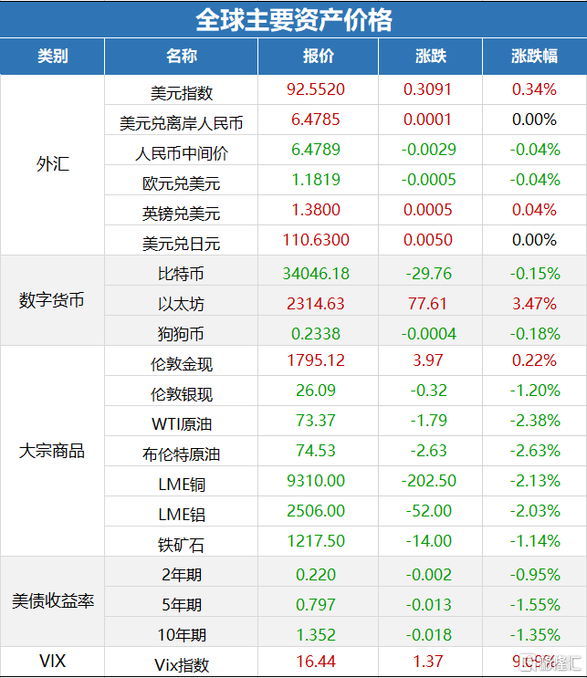 全球主要资产价格方面,国际原油期货大幅收跌, WTI8月原油期货收跌1.79美元,跌幅2.38%,报73.37美元/桶。布伦特9月原油期货收跌2.63美元,跌幅3.41%,报74.53美元/桶。纽约黄金期货小幅上涨0.22%报1795.12/盎司,盘中一度涨至1815上方。比特币徘徊于34000美元/枚附近,以太坊走势偏强收涨3.47%报2314.63/枚。
