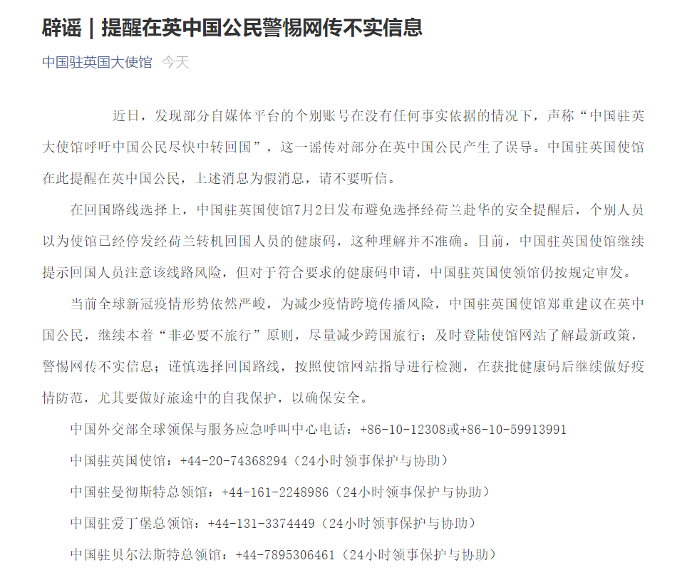 原标题:中国驻英使馆辟谣:“中国驻英大使馆呼吁中国公民尽快中转回国”是假消息